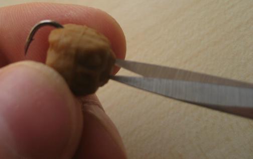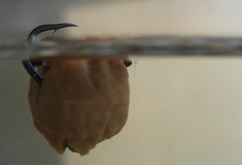 Another trick is to hide the actual hook well. I do this by adding weight to the end of the bait, this causes it to flip over so the hook point sticks out of the water, rather than underwater where it is clearly more visible. You can also hide most a the shank by clueing it into the bait itself. Hiding the hook when surface fishing is illustrated using the photos below.