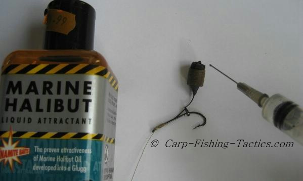 I like to use an oil based liquid. If these carp rigs have been prepared at home then I'll get chance to soak them for longer. If made up on the bank I'll use a syringe to add flavours and liquids.