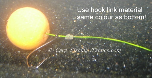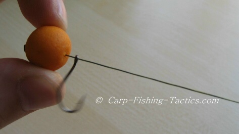 There needs to be a rig stop placed about 10mm from the boilie. This stops the hook from travelling up the hook link material, plus, it gives the hook more freedom to spin easily enabling the hook to drop down and catch a hold in flesh. The rig stop can also be adjusted for more, or less freedom.